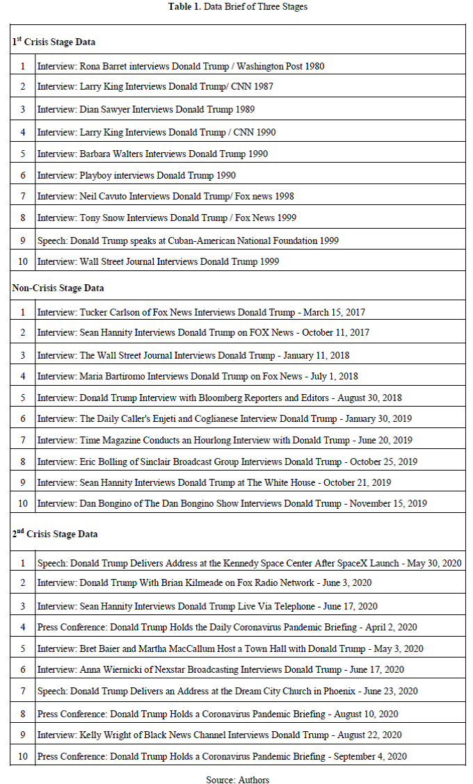 In designing the three stages, we took great care to ensure that data gathered for all stages were similar in the diversity of documents, different settings, and the number of wordings. Following Hermann (2003) and Walker & Schafer (2006), a minimum of 50 documents or 5,000 words is required for a valid cognitive profile. Therefore, for each stage, more than 5,000 words had been collected from Donald Trump's speeches and interviews in the three mentioned timings. The documents were collected through public sources, news agencies, the White House website, or archival media outlets such as Fact Base (RollCall, 2021) (See Table 1).