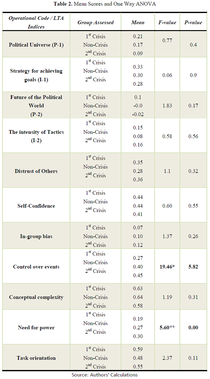 Table 2 reports the results of the eleven indices (seven LTA traits and four OCA indices) on the three stages under assessment. Only one of the indicators shows statistically significant differences (P<0.05): Need for Power. The Control over Events trait has a high F value, meaning that the trait may be significant in one of the stages. Higher rates in Need for Power (from 0.19 to 0.33, F = 6.22, P = 0.00) can be a sign of an increased tendency toward holding power during the election year and the time of crisis. This result can be an indication of challenging environmental constraints and should be analyzed in relation to other LTA traits and OCA indices.