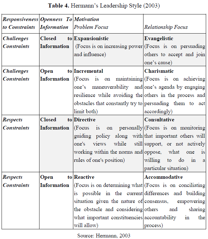 According to Hermann (2003) LTA, when assessing the individuals’ leadership style, we should assess these main concepts: a) the extent to which the leader respects or challenges environmental constraints; b) his/her openness to contextual information; and c) his/her motivations toward taking office. Each of these dimensions is determined through the relationship of specific traits toward one another. Table 4 illustrates Hermann (2003) Leadership Style based on the seven LTA indices. A low to mean score on the Control over Events trait, alongside a low score on the individual’s Need for Power means that the leader has a tendency to challenge environmental constraints.