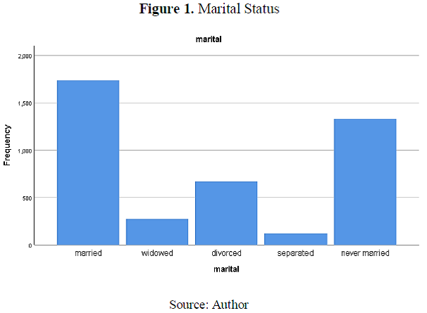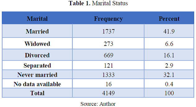 Diagrams and tables were used to present our demographic and descriptive findings of the research. Marital status is an important demographic factor in one’s attitudes. Table 1 shows that 41.9% of the sample were married, 6.6% were widowed, 16.1% were divorced, 2.9% identified themselves as separated, 32.1% said they never married, and 0.4% did not respond to this question. Figure 1 shows marital status in a visual way.