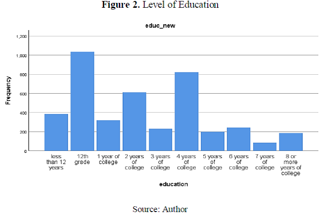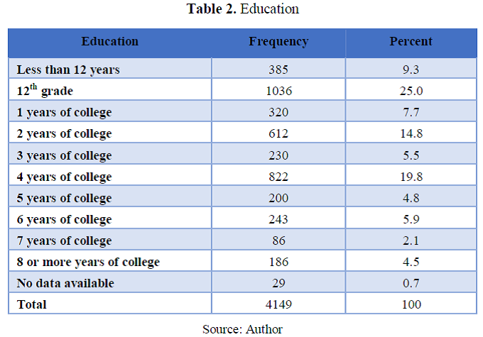 The distribution shows that 19.8% of the population, or 822 individuals, have 4 years of college education. Additionally, 4.8% (200 individuals) have completed 5 years of college, while 5.9% (243 individuals) have 6 years of college education. A smaller segment, comprising 2.1% of the population, has 7 years of college education, amounting to 86 individuals. Those with 8 or more years of college make up 4.5% of the population, totaling 186 individuals. The information on respondents’ education level has been represented in Table 2 and Figure 2.