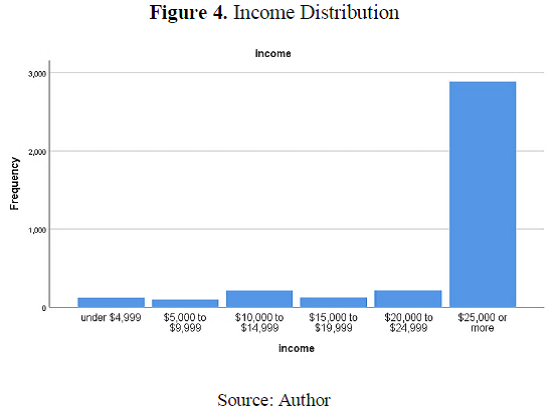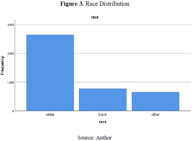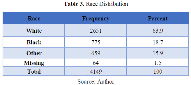 Race is an important demographic factor in the US. Table 3 and Figure 3 show the distribution of race in our sample. Results show that 63.9% of the respondents identified themselves as white, while 18.9% considered themselves black. 15.9% of the respondents considered themselves as “other” races and 1.5% did not respond to this question.