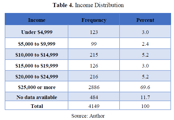 Figure 4 shows that the largest segment of the population, comprising 69.6%, earns $25,000 or more, which includes 2,886 individuals. Additionally, there is a segment representing 11.7% of the population, or 484 individuals, for whom income data is missing.