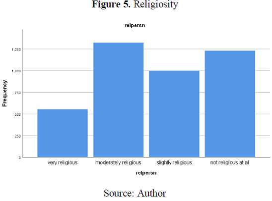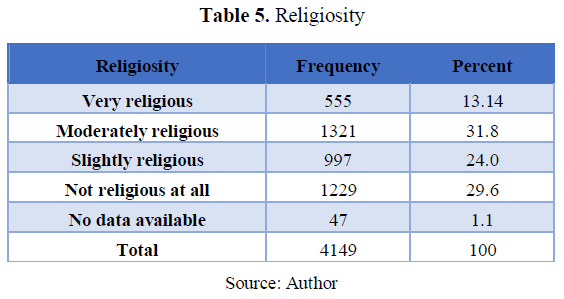 The majority of Americans are known to be Christian and religion is still an important issue in this country. According to table 5, 13.14% of the population, representing 555 individuals, identify themselves as very religious. The largest segment, at 31.8%, consists of those who are moderately religious, accounting for 1321 individuals. Those who consider themselves slightly religious make up 24.0% of the population, with a frequency of 997 individuals. Individuals who are not religious at all represent 29.6% of the population, totaling 1229 individuals. There is also a small percentage, 1.1%, comprising 47 individuals, for whom religiosity data is missing. Figure 5 shows the information on religiosity of the respondents in a visual manner.