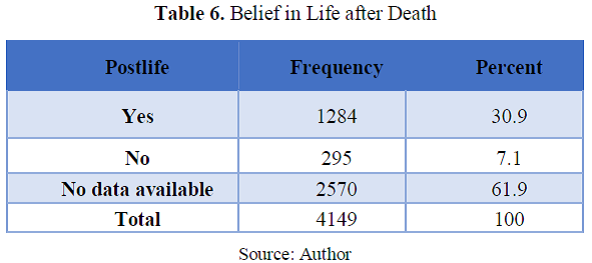 We were interested in knowing respondents’ beliefs regarding life after death. According to table 6, 30.9% of the population, representing 1284 individuals, believe that there is life after death. A smaller segment, 7.1%, comprising 295 individuals, do not believe in life after death. The largest portion of the data, 61.9%, representing 2570 individuals, is missing or unreported. Table 6 and Figure 6 represent how Americans are divided on belief in the life after death.