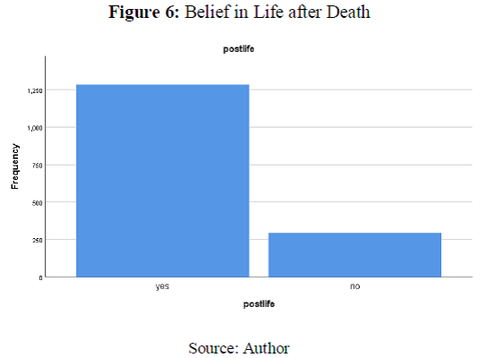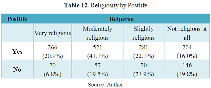Based on Pearson's chi-squared test results, there is a relationship between one’s religiosity and belief in the existence of a life after death (Pearson's chi-squared =177.612; P = 0.000). Table 12 shows the distribution of religiosity by postlife variable.