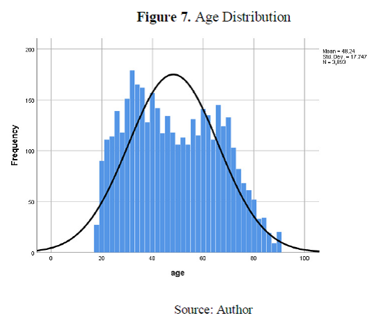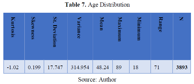 Our data bank also contained information about respondents’ age. According to table 7, the kurtosis value for age variable is -1.02, indicating a platykurtic distribution. This means that the data has lighter tails and a flatter peak compared to a normal distribution. The skewness value is 0.199, suggesting a slight positive skew. This indicates that the age distribution is slightly skewed to the right, meaning there are marginally more older individuals in the population compared to younger ones.