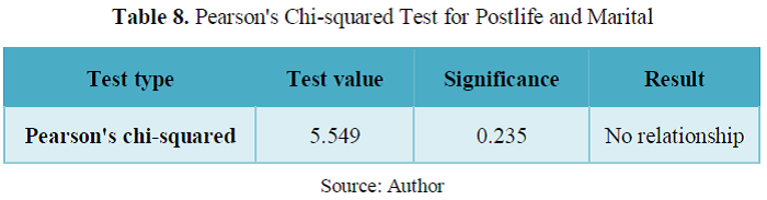 As illustrated in table 8, there is no relationship between the variables postlife and marital.