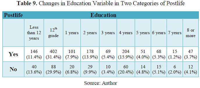 Table 9 and Pearson's chi-squared test show that there is no relationship between postlife and education (Pearson's chi-squared= 11.054, Sig. = 0.272).