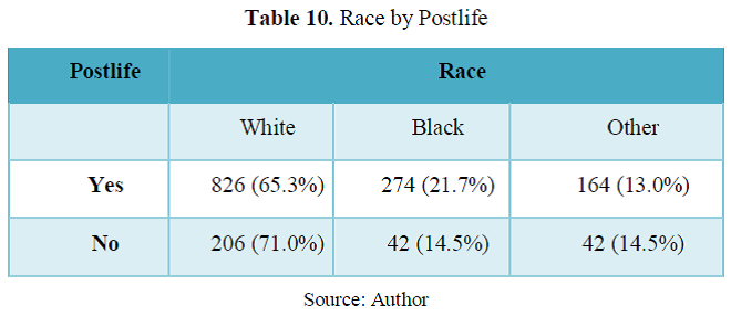 As we can elicit from Table 10, and according to Pearson's chi-squared test results, there is a relationship between race and postlife. Black people are more likely to believe that there is a life after death (Pearson's chi-squared = 7.557; P=0.023).
