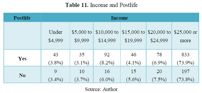 Table 11 and Pearson's chi-squared test results indicate that there is no relationship between income and postlife (Pearson's chi-squared = 2.965; P = 0.707).