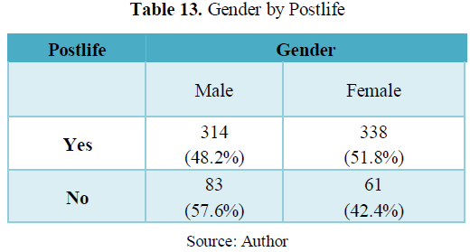 According to Pearson's chi-squared test results, there is a relationship between gender and belief in life after death (Pearson's chi-squared = 4.240; P = 0.043). American women are more likely to believe that there is another life after death. Table 13 shows the distribution of gender by postlife variable.