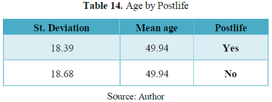 We were interested in knowing if age was a significant factor in an American citizen’s perception of life after death. We used t-test to see if there was a meaningful age difference between those who responded yes or no to the postlife question. It was revealed that there is no age difference between the two groups. Table 13 shows the distribution of age by postlife variable.