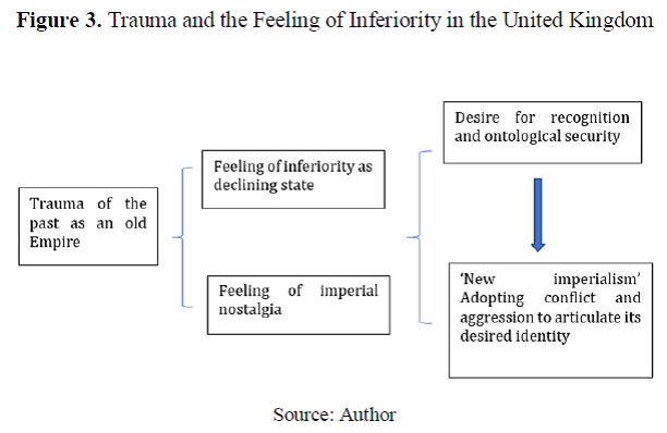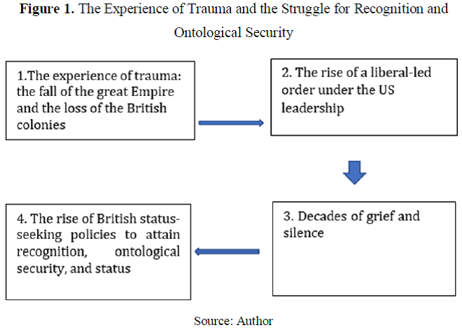 It can be argued that the root of the United Kingdom’s sense of aggression also stems from the loss of its status and dignity as a great power. Drawing from the discussion above, it appears that the UK harbours a longing to return to its former glory as a leading nation, resisting any characterization as a middle power. Although a 'New British History' began to take shape in the 1980s, successive governments have never lost sight of the aspiration to reclaim greatness. During this period, critiques of the Anglocentrism inherent in traditional historiography emerged alongside a new approach, suggesting that future British history should adopt a more genuinely multinational perspective, incorporating the distinct histories of England, Scotland, and Wales (Koditschek, 2002). Following from the earlier premises, Britain suffers from a lack of ontological security as a great power. Britain constantly desires to get recognition from the existing great powers to act as a pivotal power in the international society. Thus, the source of UK’s feeling of ontological insecurity resides in two driving forces: First, the experience of the fall of the great Empire and the feeling of trauma. Broadly speaking, the experience of trauma is a painful ontologically feeling among the actors in a society. Caruth (1996) describes trauma as an unconscious experience of sudden or catastrophic events, an uncontrolled response to an unexpected or overwhelming violent event (Caruth, 1996, pp. 91-92). In this endeavour, as indicated in figure 1, past events or states’ collective traumas can shape states’ present behaviour — pushing actors to adopt provocative policies to reclaim their social status (Charoenvattananukul, 2020, pp. 182–185). Second, a lack of a biographical narrative, routines, and a sense of continuity as a great nation. These factors serve as an additional driving force for the British to achieve ontological security, maintaining their independence and a stable social identity.