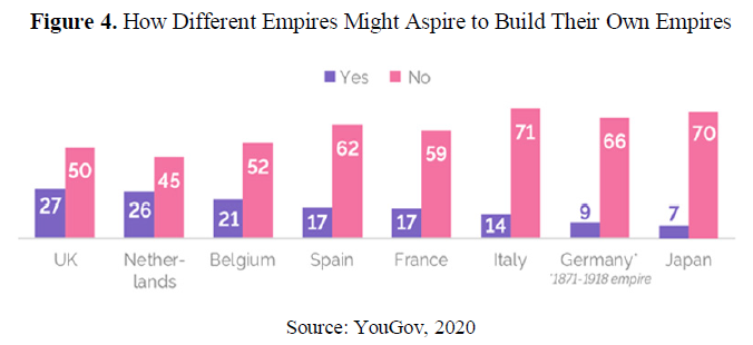 Clearly, besides strong nostalgic feelings and the sense of a glorious past among the British government, the feeling of the revival of the British past identity is still a noticeable sentiment among the British people as indicated in figure 3. A YouGov survey conducted in 2020 compares attitudes towards former empires in eight countries namely Britain, France, Italy, Spain, Belgium, Japan, the Netherlands, and Germany from 1871-1918. According to this survey, people in all countries hardly have a uniquely romantic view of their former empires. Many of the former empires responded negatively to the question ‘Would you like to have an empire?’ For instance, Italy and Japan experienced 71% and 70% opposition, respectively, while France stood at 59%. Interestingly, Britain and the Netherlands demonstrated the strongest nostalgic sentiments about their former empires, with 27% and 26%, respectively—the highest among the eight countries analysed. As indicated in figure 4, nearly a quarter of British respondents expressed a desire for their country to still have an empire today.