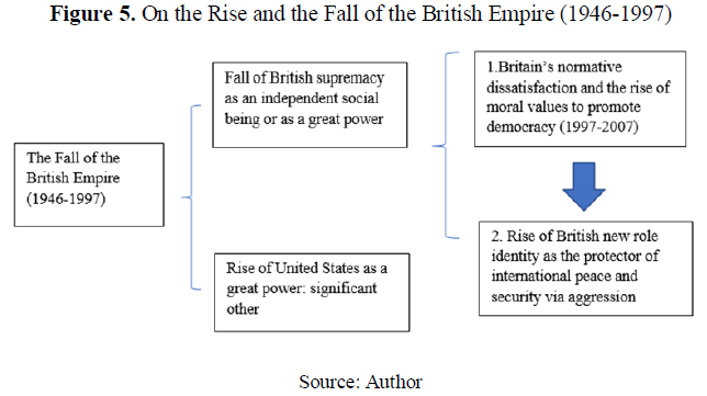 With close collaboration between the US and the UK, Britain primarily follows two major doctrines to establish its desired social identity as an independent entity within the international community. This approach involves employing aggression to achieve recognition, ontological security, and status. Two key points warrant attention here. First, under the New Labour government, the United Kingdom sought to position itself as a “moralizing force”, promoting the expansion of democracy along with British norms and values. Second, the UK actively emphasized humanitarian interventions aimed at dismantling dictatorial regimes and so-called rogue states, with the goal of fostering peace and security in other nations through conflict-driven actions as indicated in figure 5.