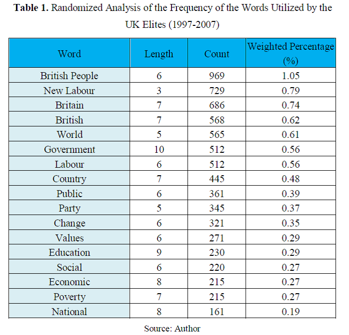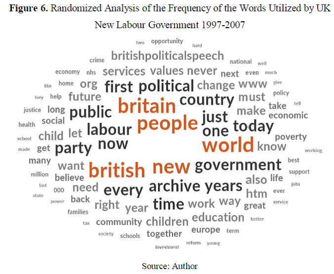 This study is a mix-method research, taking into account research objectives and research method from both qualitative and quantitative methods for gaining a more in-depth understanding of states’ behaviour, attitudes, and beliefs. In fact, due to the novelty of the article’s theoretical framework, UK’s long history, and the dearth of data on UK’s true intentions toward other states, a process tracking approach will be deemed inclusive. The internal dynamics of the UK decision-making process has a bearing on the outcomes and therefore the influence of the UK on other actors. Therefore, the author will randomly utilize official speeches and interviews by UK’s elites. This random analysis was conducted by examining primary sources of 43 official speeches (British Archive, 1997-2007) delivered by UK’s governmental elites namely Tony Blair- the leader of the New Labour government, Johnson, Alan-Home Secretary speech, and Gordon Brown- the leader of the Labour party from 1997 to 2007. Through this analysis, conducted by the INVIVO program, this paper uses several first-hand interviews and speeches delivered on public to infer how much the New Labour government has focused on key normative concepts such as people, Britishness, or British value. According to the content analysis provided, it is evident that the UK government and mostly the New Labour prime minister have heavily focused on four keywords such as people, New/New Labour, Britain/British and, the world. The UK Prime Minister Blair has repeatedly utilized the above-mentioned key words more than 3500 times over time.