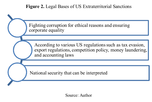 - Sanctions extending the impact of U.S. unilateral measures: Examples include penalties against BNP Paribas in 2014 and Deutsche Bank in 2015 (Berard et al., 2018). These measures aim to amplify the effects of primary sanctions. Figure 2 outlines the legal basis of extraterritorial sanctions under U.S. law.