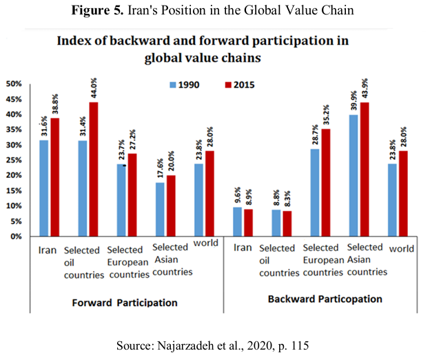 Iran’s exclusion from global value chains, as a consequence of sanctions, has deeply affected its economy and position in international trade. This process signifies the reduction or elimination of Iran's role in the production, distribution, and delivery of goods and services in global markets. For instance, oil and industrial sanctions drastically reduced Iran’s exports of oil and petrochemical products, diminishing its role in the global energy supply chain. Numerous multinational companies integral to global value chains refrained from engaging with Iran due to U.S. sanctions. Fearing secondary sanctions and hefty fines, these companies exited the Iranian market, severing Iran’s links to these chains. A prominent example is the withdrawal of Siemens from the Iranian market ().