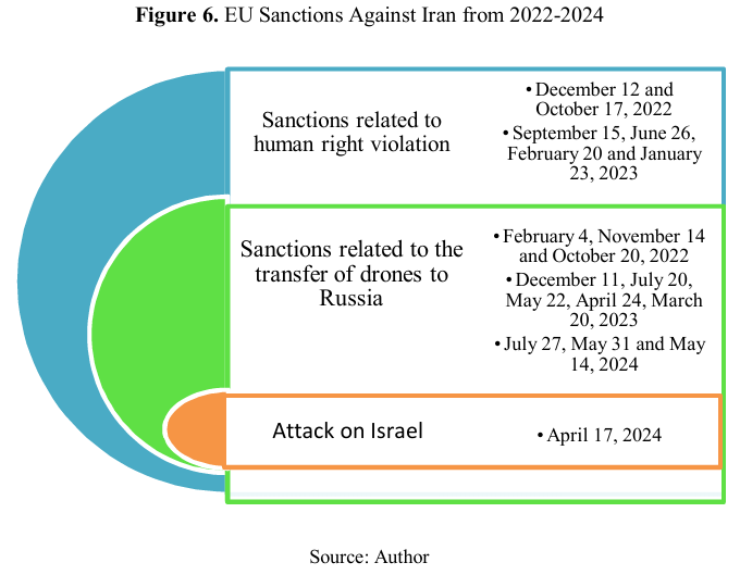 Following the death of Mahsa Amini On 16 September 2022 and Iran’s policies regarding the Ukraine crisis, the U.S., followed by the EU, imposed new sanctions against Iran. These measures reflected growing European frustration. Although earlier sections explained the EU’s opposition to extraterritorial sanctions due to their impact on dialogue with Iran and legal complications, by November 2022, the EU began to change course, sanctioning 32 Iranian individuals and entities (European Council, 2024). A review of the sanctions adopted by the EU against Iran from 2022 to July 2024 is summarized in the following figure.