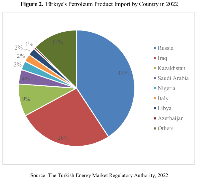 As illustrated in figure 2, Türkiye’s petroleum product imports are predominantly sourced from Iraq, Saudi Arabia, and Russia. This import structure underscores Türkiye’s role as a strategic energy transit hub, facilitating the movement of substantial oil volumes between key Eurasian and Middle Eastern supply regions and European demand centers (Novikau & Muhasilović, 2023).