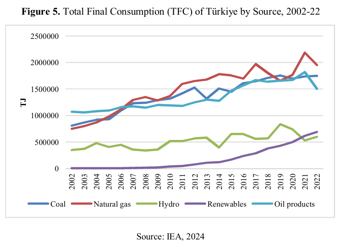 According to figure 4, Turkish natural gas demand is met by imports since the share of domestic gas production (less than 1%) is used to supply domestic demand. Furthermore, Turkish natural gas consumption has steadily increased, becoming the first-largest energy source in Total Final Consumption (see figure 5).