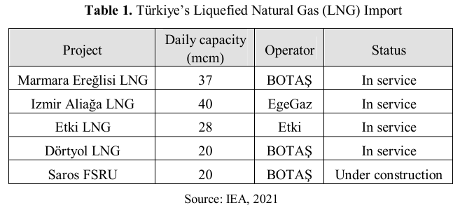 The Blue Stream pipeline, with an annual capacity of 16 bcm, which has been commissioned since 2003, brings Russian gas to Türkiye via the Black Sea. Furthermore, 10.4 bcm of natural gas supply is exported by pipeline from Iran to Türkiye via the Eastern pipeline since 2001. Another gas pipeline is the Turkish Stream. Türkiye and Russia signed a contract in 2016 for the construction of Turkish stream; the pipeline, commissioned in 2020, is capable of carrying 31.5 bcm of gas annually. According to the agreement between the two governments, the volume of 14 bcm of gas that was delivered to Türkiye through the Western pipeline will enter the country from now on through this new pipeline (Tastan, 2022).