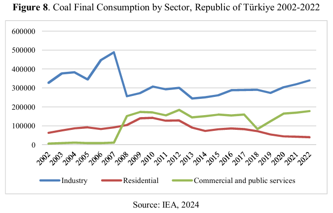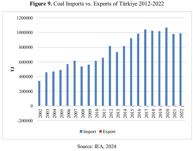 In recent years, coal has stabilized its share in the total primary energy supply, but its share in total final consumption has decreased; however, its share in electricity generation has increased. Türkiye owns large coal reserves called Lignite, which represent approximately 42% of the domestic energy mix. According to Figure 10, industry, residential, commercial, and public services sectors consume the most amount of coal. Furthermore, figure 11 illustrates the fact that Türkiye’s coal import has increased since 2010.