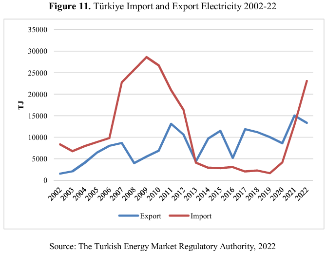 The Turkish electricity network is connected to most of its neighbors, but the amount of electricity imported and exported is relatively insignificant compared to the amount consumed and produced within the country. Türkiye exported approximately 3710 GWh in 2022, less than 1% of its domestic production, and imported nearly 6414 GWh. As a result of Turkish export and import, the country imported 2704 GWh in 2022. Figure 13 shows that Türkiye's electricity imports and exports have fluctuated in recent decades; therefore, it is sometimes a net exporter of electricity and sometimes a net importer of electricity. Furthermore, Türkiye is connected to most of its neighbors, imports mainly from Bulgaria and exports mainly to Greece, but the net trade is small compared to the total amount of electricity produced.