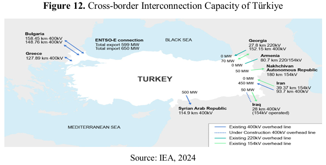 Figure 14 shows Türkiye’s cross-border interconnection electricity capacity. Through interconnections with Greece and Bulgaria, Türkiye can import 600 MW of electricity and export 500 MW to Europe.