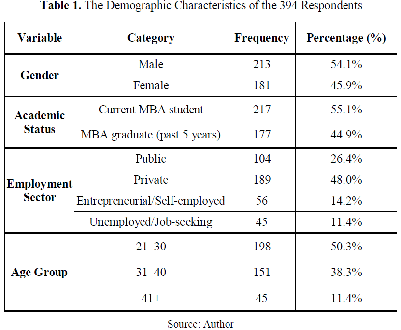 The sample included a near-equal gender distribution, with 54.1% identifying as male and 45.9% as female. In terms of academic status, 55.1% were currently enrolled MBA students, while the remaining 44.9% had graduated within the last five years. The respondents represented diverse professional sectors: 48.0% were employed in the private sector, 26.4% in public institutions, 14.2% were self-employed or entrepreneurs, and 11.4% reported being unemployed or actively seeking employment. The majority of participants were between the ages of 21 and 40, with 50.3% aged 21–30 and 38.3% aged 31–40.