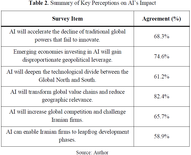 This study has sought to illuminate how Iranian MBA students and recent graduates perceive the disruptive potential of AI in reshaping global power dynamics. By integrating quantitative and qualitative data, the findings present a nuanced view of a generation poised to influence Iran's economic and strategic trajectory. The results affirm that AI is widely perceived not merely as a technological development, but as a geopolitical force capable of redefining national sovereignty, economic competitiveness, and global hierarchies. Research demonstrates that technological literacy initiatives can mitigate exclusion in digital transitions, offering a framework for ensuring AI's disruptive potential strengthens rather than fragments societal resilience (Sakhaei et al., 2024a). Participants consistently expressed both optimism and anxiety: optimism regarding AI’s capacity to enable emerging economies like Iran to bypass traditional stages of industrial development, and anxiety concerning technological dependence and the risks of widening global inequalities. Such dual perspectives reflect broader professional attitudes toward AI, where recognition of transformative potential coexists with concerns about infrastructural readiness and equitable implementation (Tomraee et al., 2022).