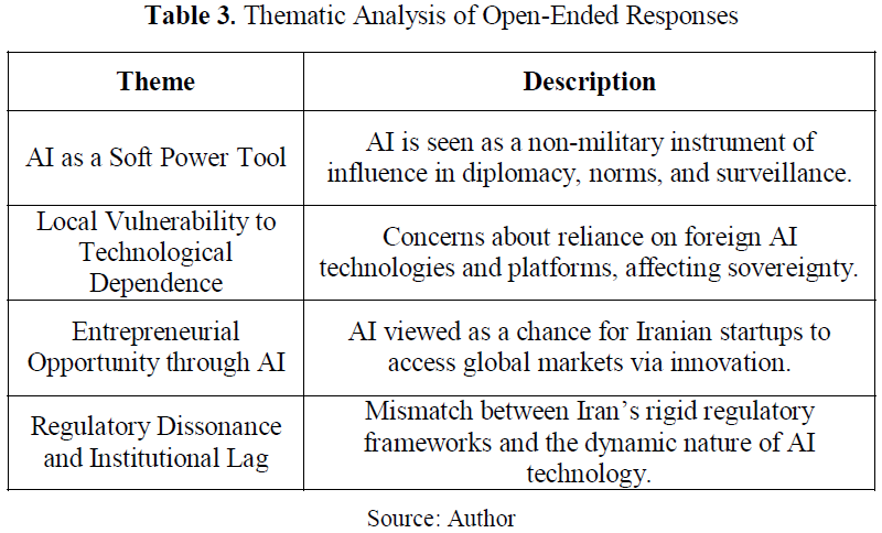 Table 3 provides a thematic analysis of the responses received in this study. As illustrated in Table 3, main themes include: (1) AI as a Soft Power Tool; (2) Local Vulnerability to Technological Dependence; (3) Entrepreneurial Opportunity through AI; and (4) Regulatory Dissonance and Institutional Lag.