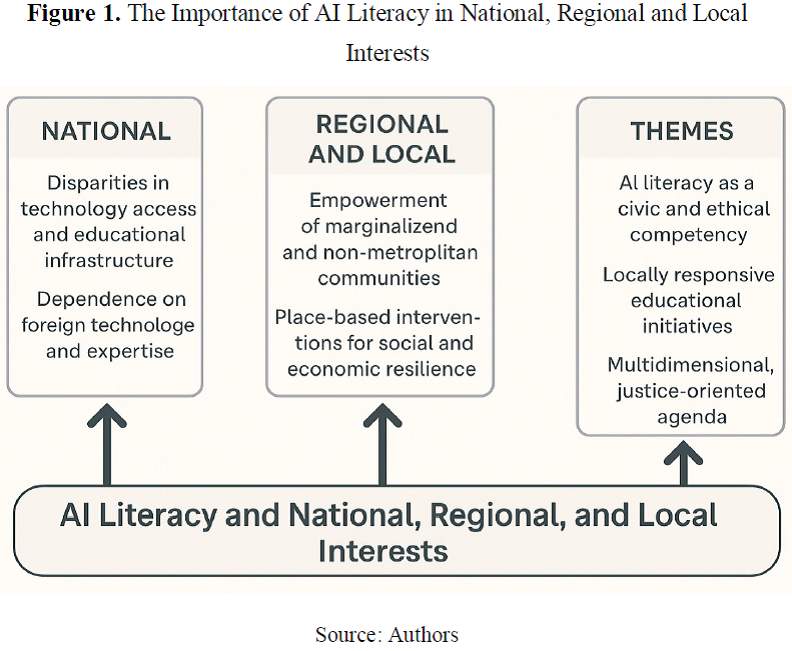 Lastly, regional and local adaptations emerge as vital for equitable AI integration. Brites (2024) and Zreik (2024) illustrate how place-based interventions, aligned with local civic goals and regional labor needs, can close AI literacy gaps and build social resilience. The literature collectively suggests that without such contextualization, AI adoption risks entrenching existing inequalities and alienating non-metropolitan populations from emerging digital economies. Figure 1 summarizes the importance of AI literacy in national, regional and local interests.