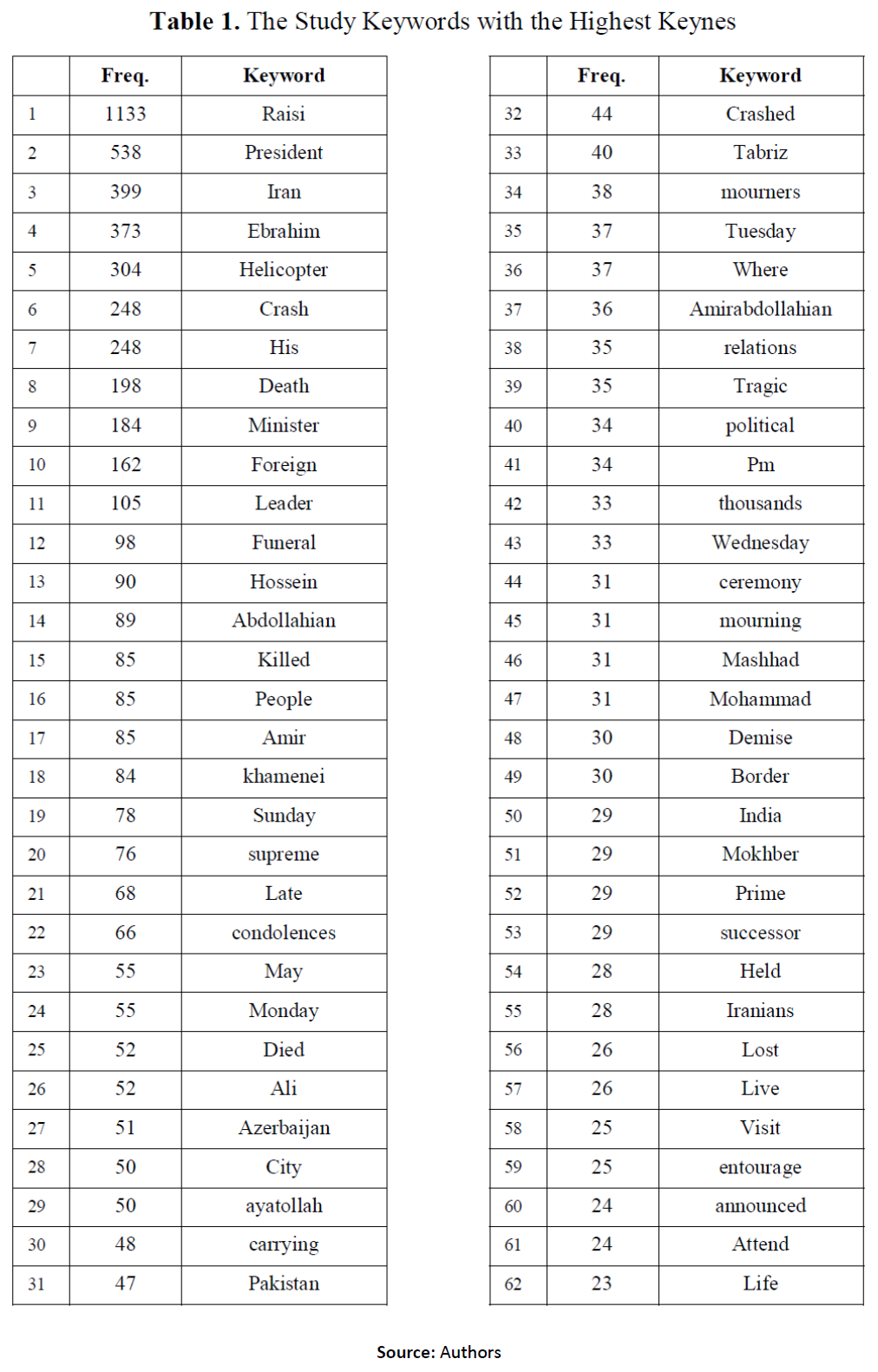 As described in the sampling section, approximately 1000 cases were selected to be analyzed. This analysis resulted in approximately 400 significant keywords. Table 1 is a sample of the first 100 keywords with the highest frequency. In the studied corpus, Raisi with a frequency rate of 1133 is the most frequent keyword, and president (538), Ebrahim (373), helicopter (304), crash (248), death (198), and funeral (98) follow it in their frequency rate.
