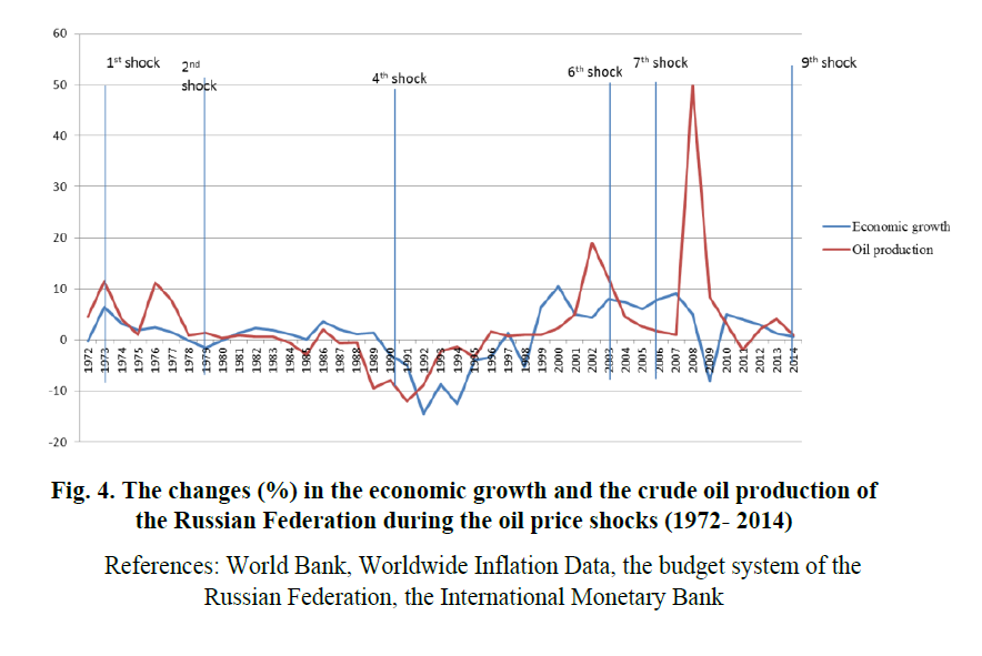 Fig. 4. The changes (%) in the economic growth and the crude oil production of the Russian Federation during the oil price shocks (1972- 2014)