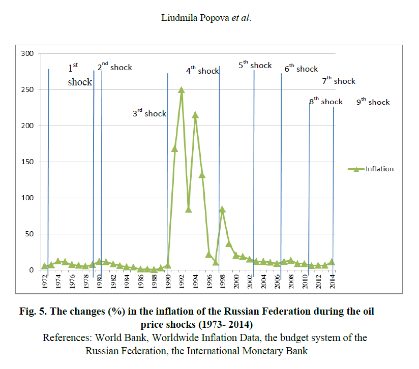 Fig. 5. The changes (%) in the inflation of the Russian Federation during the oil price shocks (1973- 2014)