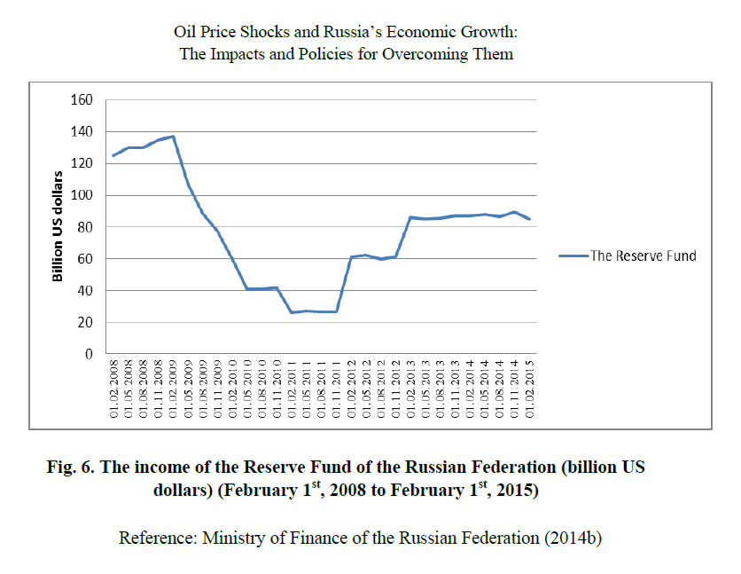 As mentioned in the previous section, Russia earned an excessive income through the positive shock in the world oil prices during the sixth oil shock in 2003. Therefore, in the beginning of 2004 and based on the Law No. 184 of the Russian Federation, Vladimir Putin ordered for a stabilization fund (стабилизационный фонд) to be created from the sudden increases in the world oil prices, as a cover for the total impacts of oil price shocks and to secure the country’s income. According to the Law related to Russia’s Ministry of Finance (Министе́рство фина́нсов Росси́йской Федера́ции [Минфин России]), the fund is collected in three foreign exchanges with a ratio of 45- 45- 10 (dollars, euros, and pounds). It is noteworthy, of course, that the fund is also obtained through selling gas; however, the primary goal of creating such a fund was for the optimal use of the income from positive oil shocks.