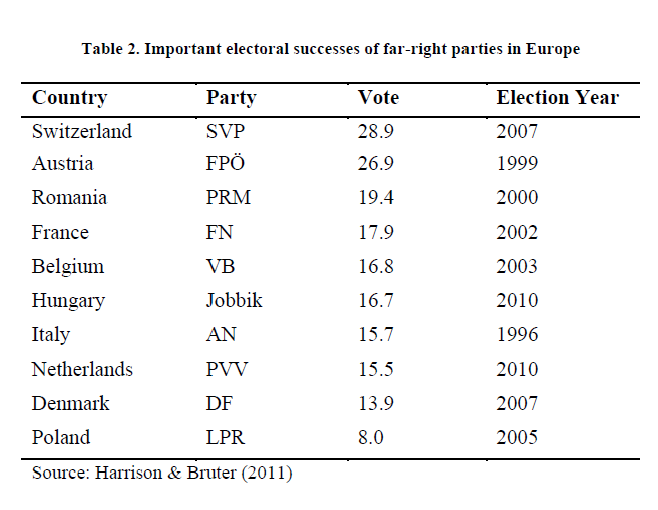 Wilders, the Dutch far-right leader, calls Islam a totalitarian ideology and compares the Qur’an with Hitler’s book Mein Kampf (Bjurwald, 2010: 17). The votes of this party rose from 5.9 in 2007 to 15.5 in 2010, gaining 19 seats in the parliament (van Kessel, 2011). Following the 2007 elections, the SVP far-right party, with an emphasis on issues such as immigration, European Union, refugees and Islam made substantial electoral gains by gaining 29% of the votes and 62 seats in the parliament (Wilson & Hainsworth, 2012: 6). This party is an example of successful far-right parties. In the 2005 elections, the Norwegian anti-tax, anti-immigration, anti-establishment and populist Progress Party gained a 22% electoral success and 38 seats in the parliament. In the 2010 elections, the Belgian Flemish Interest (VB)- the largest far-right party in the country- won 15 seats out of the 150 seats of Belgian parliament with 8.7% of the votes. This party calls for Finnish independence and preservation of Finnish traditional values (Ahmadi Lafuraki et al., 2013: 71).