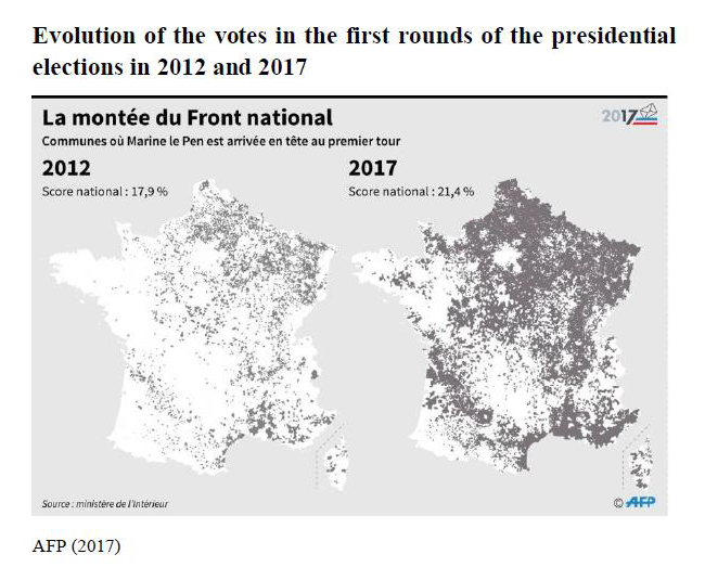 - AFP [Agence France-Presse]. (2017, April 24). INFOGRAPHIC: L'évolution des votes aux premiers tours des élections présidentielles de 2012 et 2017 [Twitter moment]. Retrieved from https://twitter.com/afpfr/status/856442731048181760/photo/1.