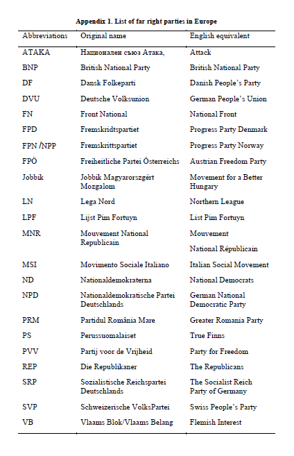 - Smith, J.M. (2003). Extreme politics: an analysis of the state level conditions favoring far right parties in the European Union, Thesis for Master’s Degree. University of North Texas, Denton, Texas. UNT Digital Library. Retrieved on 9 June 2013 from: http://digital.library.unt.edu/ark:/67531/metadc4177/.