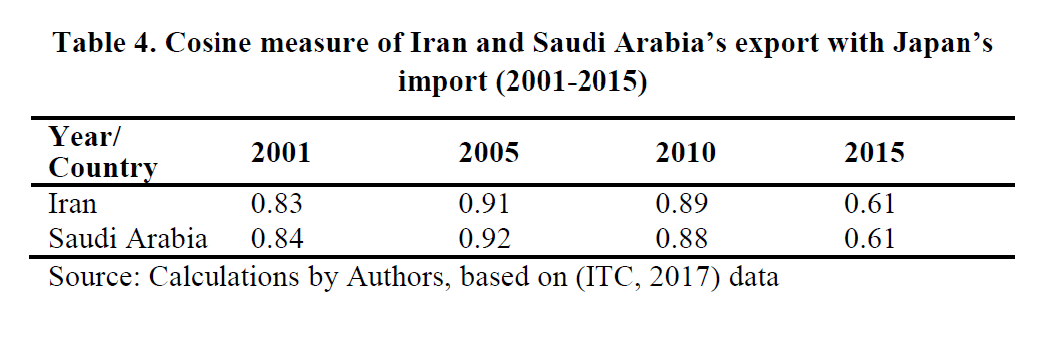 Table 4. Cosine measure of Iran and Saudi Arabia’s export with Japan’s import (2001-2015)