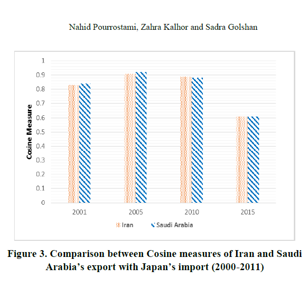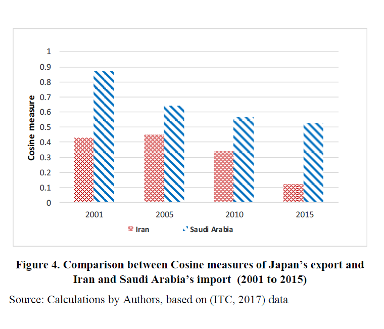 The comparison of the Cosine measures of Iran’s export with Japan’s import and that of Saudi Arabia and Japan indicates that Saudi Arabia’s potential export to Japan was not higher than that of Iran, and that the difference disappeared in 2015. In other words, Saudi Arabia and Iran have a virtually equal trade complementarity with Japan.