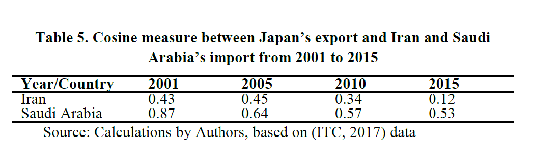 Table 5. Cosine measure between Japan’s export and Iran and Saudi Arabia’s import from 2001 to 2015