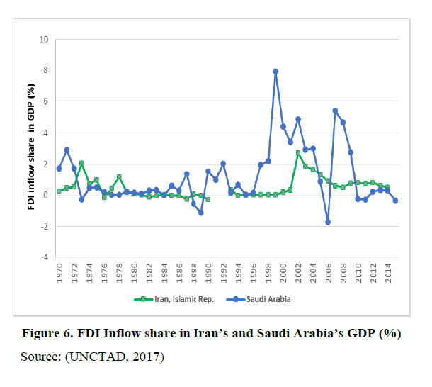Figure 6. FDI Inflow share in Iran’s and Saudi Arabia’s GDP (%)