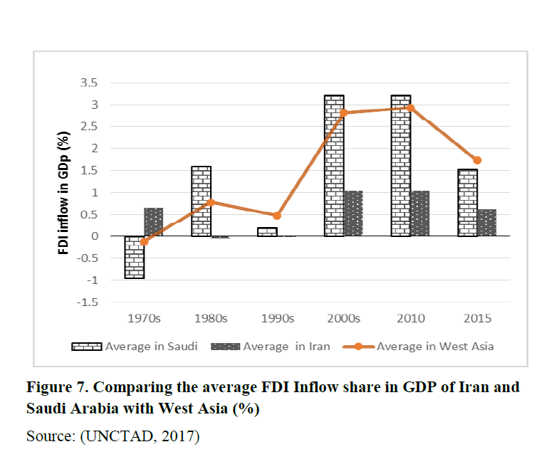 7. Foreign Direct Investment in Iran and Saudi Arabia was studied based on three indicators of FDI value in the five studied decades (1970-2015), FDI contribution to GDP over the five studied decades (1970-2015), and the International FDI Performance Index for the period (2000-2015).