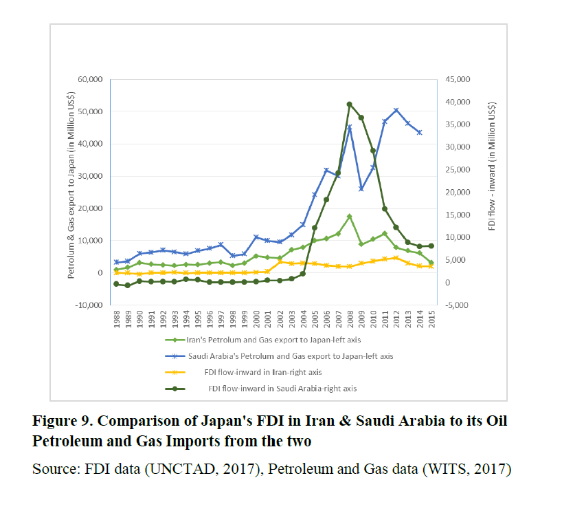 Figure 9. Comparison of Japan's FDI in Iran & Saudi Arabia to its Oil Petroleum and Gas Imports from the two