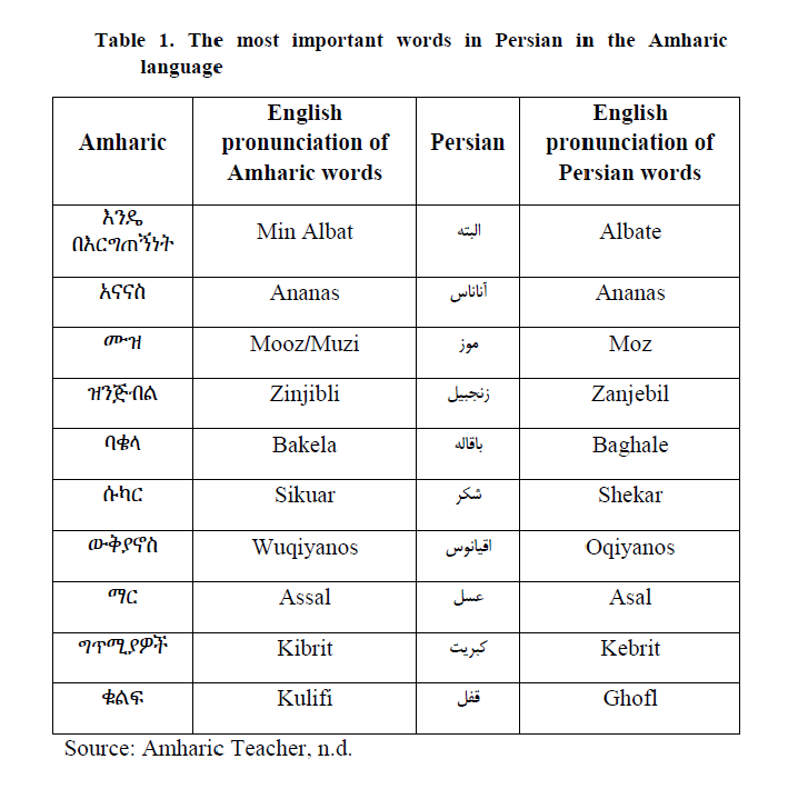 After this era, and through a course of one thousand years, when a group of Iranians travelled to this country for trade and were based in Deira in the Hararite, cultural relations between the two countries entered a new phase. The Iranians’ business practice, gradually resulting in a remarkably friendly relationship with the indigenous people of these areas, led to cultural influences and the Iranian culture and civilization were introduced to the Ethiopian people (Mehrnia, 2016). One of the most prominent cultural influences of Iranian immigrant on Ethiopia was borrowed words from the Persian language to the Amharic language. Ethiopian natives welcomed these words in such a way that in spite of the faint presence of Iranians in a small part of Ethiopia, those words are still used in the Amharic language. The most important words in Persian, as part of a permanent Iranian cultural heritage in the Amharic language are listed Table 1.