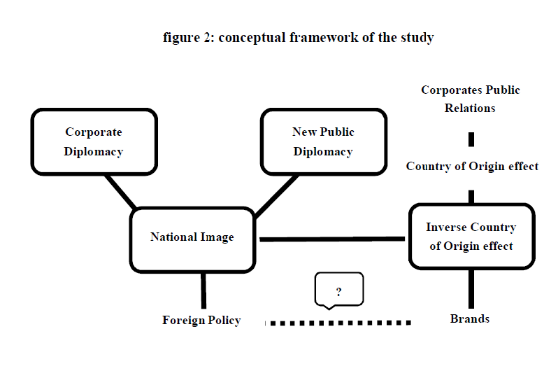 To find the answer to this question, we try to explore the relevant literature by discussing the new generation of public diplomacy, especially its difference with the other instruments used by foreign policy. In the subsequent section, corporate diplomacy will be discussed to legitimize our expectations concerning the possible roles of private corporations in public diplomacy. Then, the effect of a brand on its country of origin’s image will be explored and finally, the concept of the national image and its elements will be investigated. Consequently, the concatenation of reasoning will be completed by a mediatory concept: national image. The brand will affect the national image and the national image will affect the percception of foreign policy as illustrated in the following model: