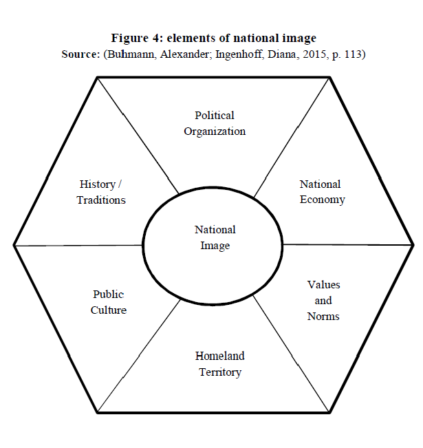 According to Melissen (2005), France was the first country that initiated national branding. He claimed that the different eras of the French history, including the kingdom, the empires, and the republics are ideal cases to study and examine the way in which identities are built and solidified, the way in which they contribute to domestic legitimacy, the way in which they contribute to the preservation of power, and the way in which they impact a country’s relations to neighboring countries. Another research that is helpful for the purpose of this study on national image is the article titled “The 4D Model of the country image, An integrative approach from the perspective of communication management” by Buhmann and Ingenhoff (2015). It analyzes national image from four perspectives. From the perspective of political science, national image is studied in the areas of international relations and political anthropology. In International Relations, national image stands under the title of public diplomacy and in political psychology, national image is defined as the perceptions of different countries where it is closely connected to the concept of national identity and is therefore culturally constructed. According to the authors, national image and reputation are tools for building a country’s image and perception in the international arena, which contributes to the development of a given country’s political capabilities. Yet, to differentiate national image from similar concepts, the authors argue the national reputation is the aggregation of foreign people’s perception, or “aggregated images”, as they call it, while national image is related to each individual or social groups in a foreign country. In addition, national identity is a self-perception by individuals inside the country, while national image is held by people outside the country (Buhmann & Ingenhoff, 2015). Based on Anthony Smith’s book titled National Identity, Buhmann and Ingenhoff (2015) illustrate the elements of national image through the following diagram: